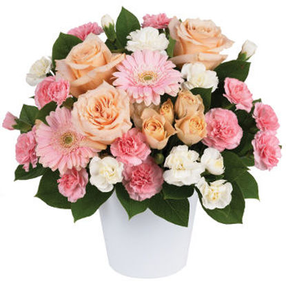 Share your sweet thoughts with this lady like arrangement of pure white gerberas, candy pink roses and soft white carnations.